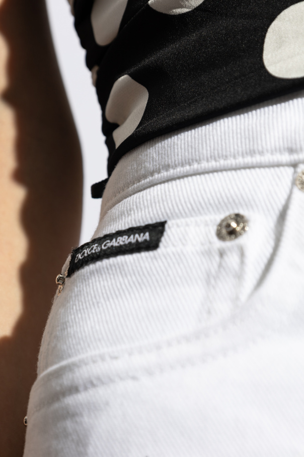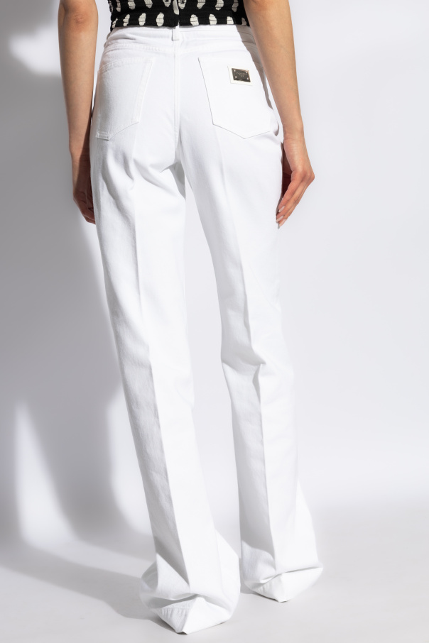 Introducing the quintessence of sartorial elegance: Dolce & Gabbana\'s Flared Leg Jeans. Crafted from premium 100% cotton, these pristine white jeans are a testament to the brand\'s commitment to luxury and meticulous design. The non-stretch fabric ensures a silhouette that is both classic and enduring, harkening back to the traditional essence of denim. The jeans feature a timeless five-pocket design—three front pockets including a petite coin pocket, and two back pockets—each serving to blend functionality with form. Secured by a zipper and button closure, and finished with belt loops for optional styling, these jeans exude a minimalist charm that is emblematic of exclusive fashion labels. A discreet black badge bearing the iconic Dolce & Gabbana logo near the front pocket subtly announces the jeans\' illustrious origins. Designed to contour gracefully at the hips before flaring elegantly towards the hem, these jeans accentuate the wearer\'s form while offering a nod to vintage aesthetics. The absence of extraneous embellishments underscores the brand\'s penchant for sophistication and class, making these jeans a versatile addition to any wardrobe. Why Purchase These Jeans? Premium Material: 100% cotton composition ensures durability and comfort. Iconic Design: Flared legs and classic five-pocket styling offer a timeless appeal. Subtle Branding: The discreet logo detailing affirms the jeans\' designer quality. Versatile Styling: Immaculate white color complements a wide range of outfits and occasions.