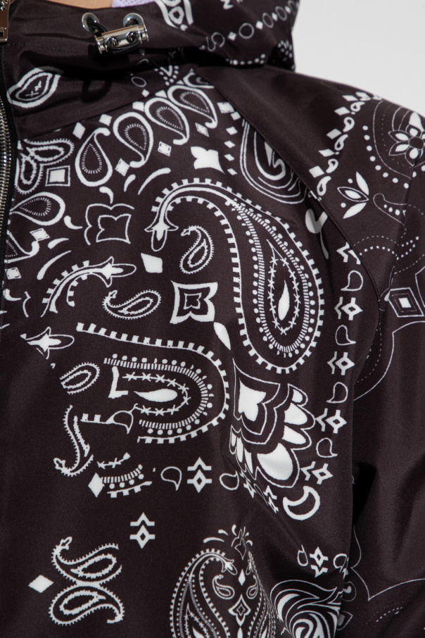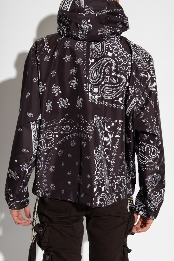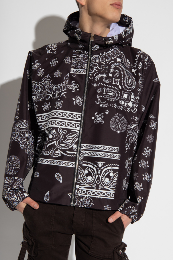 Black jacket from KHRISJOY. Fastened with a zip, this garment features a white paisley print, drawstring hood, white drawstrings with a black logo on the sides, two snap-fastened front pockets, long sleeves and mesh lining.