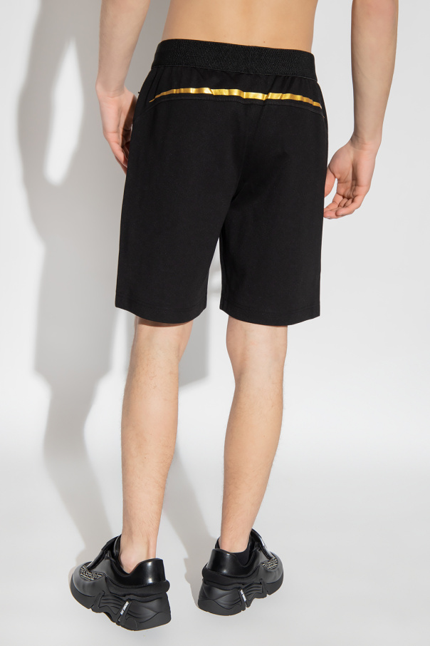 Black shorts from EA7 Emporio Armani. Emblazoned with a rubber logo application in gold-tone, this pair is cinched with drawcords at the waist and features two zip pockets and short legs.