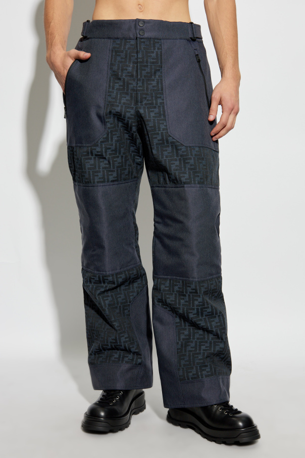Introducing the Monogram Ski Pants from the illustrious house of Fendi, a testament to over ninety years of exquisite craftsmanship. These pants captivate with their navy hue, embodying a timeless elegance that is unmistakably Fendi. The subtle monogram pattern woven into the fabric exudes exclusivity, while the wide, straight cut ensures unparalleled comfort and freedom of movement on the slopes. Crafted from a robust blend of materials, these ski pants offer superior protection against the elements, making them indispensable for any winter wardrobe. Practicality meets sophistication with front zippered pockets and an adjustable waistband, allowing for a personalized fit and secure storage of essentials. These details underscore the high quality and functionality expected from a designer of Fendi\'s caliber. Why Choose This Product? Classic navy color with an exclusive monogram design. Wide cut for comfort and mobility. Durable fabric offering protection from cold and moisture. Secure zippered pockets for convenient storage. Adjustable waistband for a customized fit.