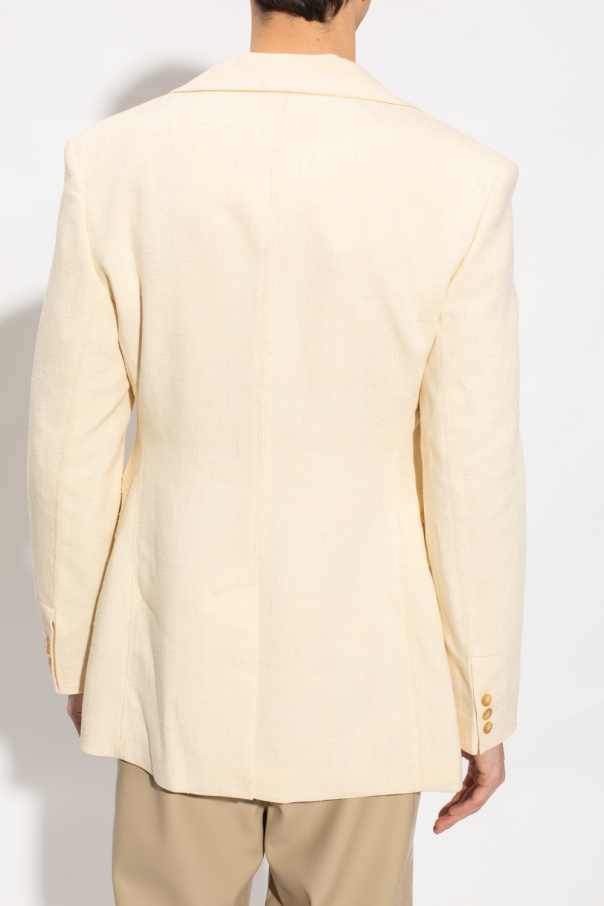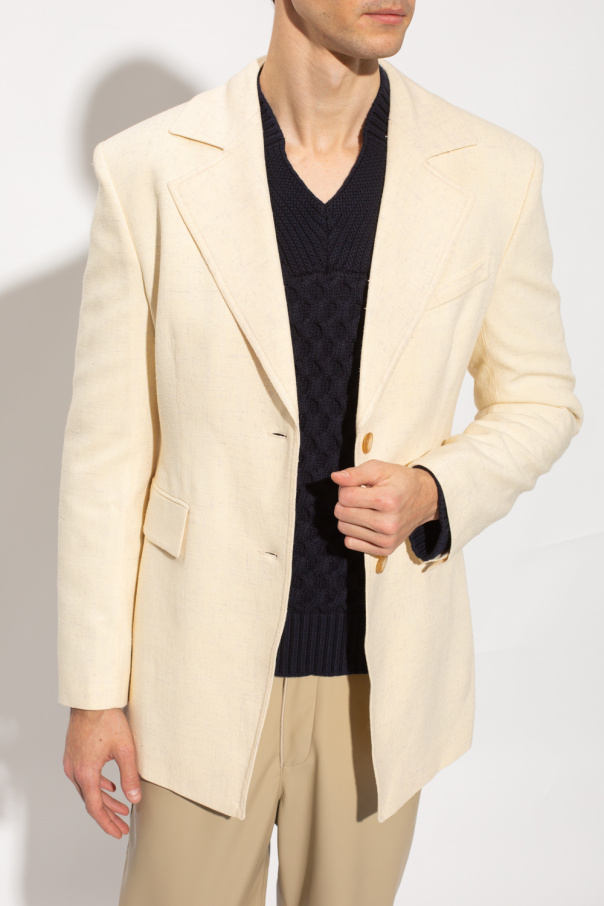 Light yellow ‘Manouk’ blazer from Nanushka. Fastened with buttons, this garment features two flap pockets, one slip pocket, notch lapels and a single rear vent.