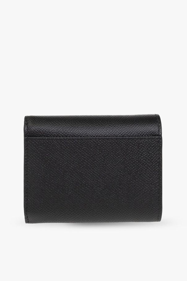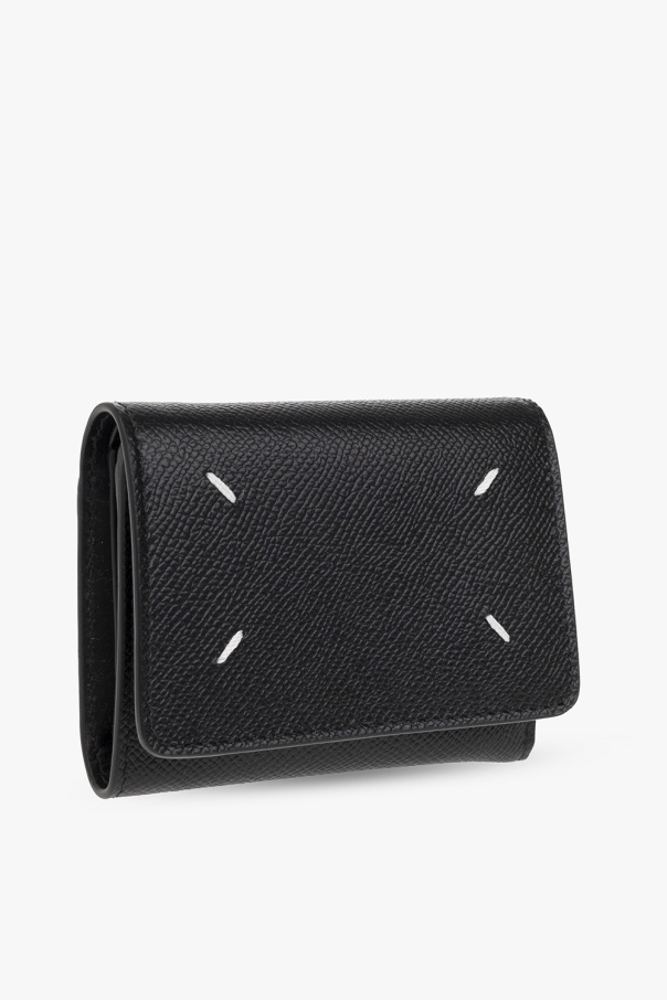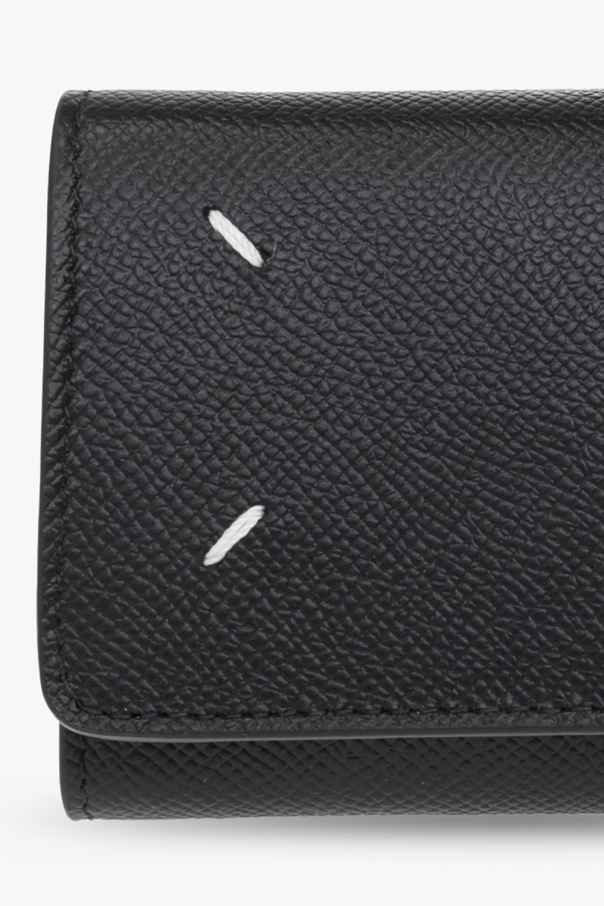Black folding wallet from Maison Margiela. Crafted from leather, this design fastens with snaps and showcases a signature white logo on the front, a back card slot and one bill compartment, one zip coin pocket, two slip pockets and four card slots inside.