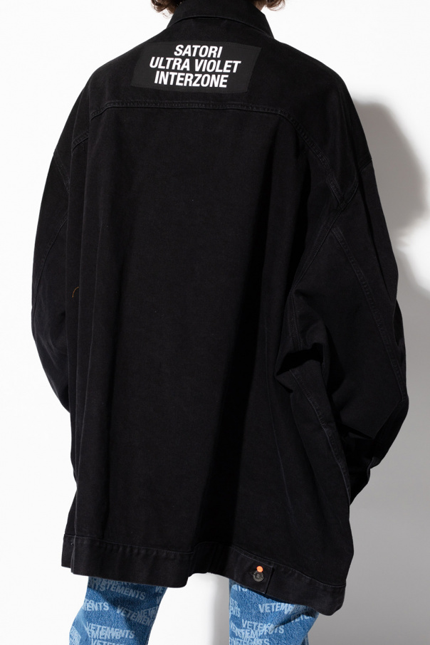 Black denim jacket from Raf Simons. Crafted from cotton with an oversize silhouette, this style features button fastenings, two welt pockets, two flapped pockets with buttons, a logo patch, silver-tone metal hardware and an attached red pin.