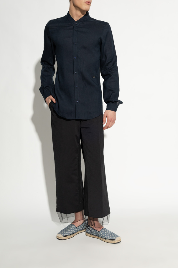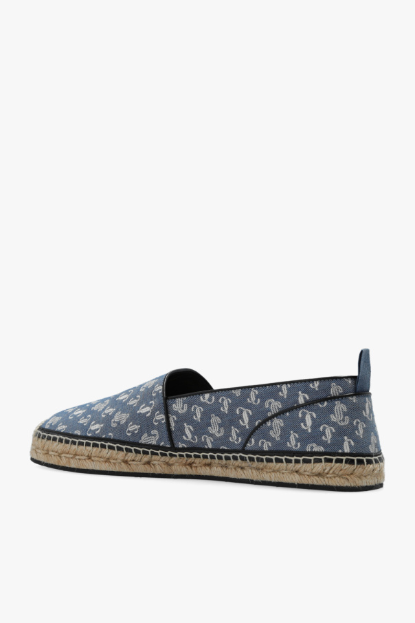 Blue ‘Egon’ espadrilles from Jimmy Choo. Made of fabric embroidered with a monogram in white, this pair features leather trimming and rubber sole in black.