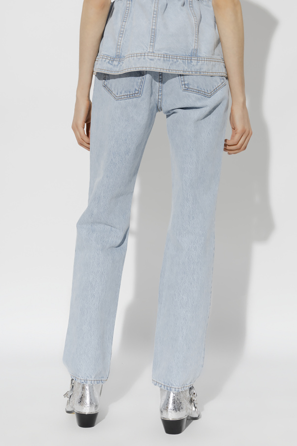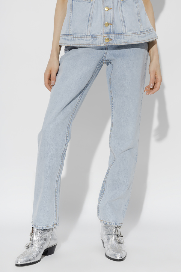 Light blue ‘Agnes’ high-waisted jeans from Ulla Johnson. Fastened with a button and zip, this pair features a beige logo-embossed patch at the back, round gold-tone charm, three front pockets, two back pockets and straight legs.