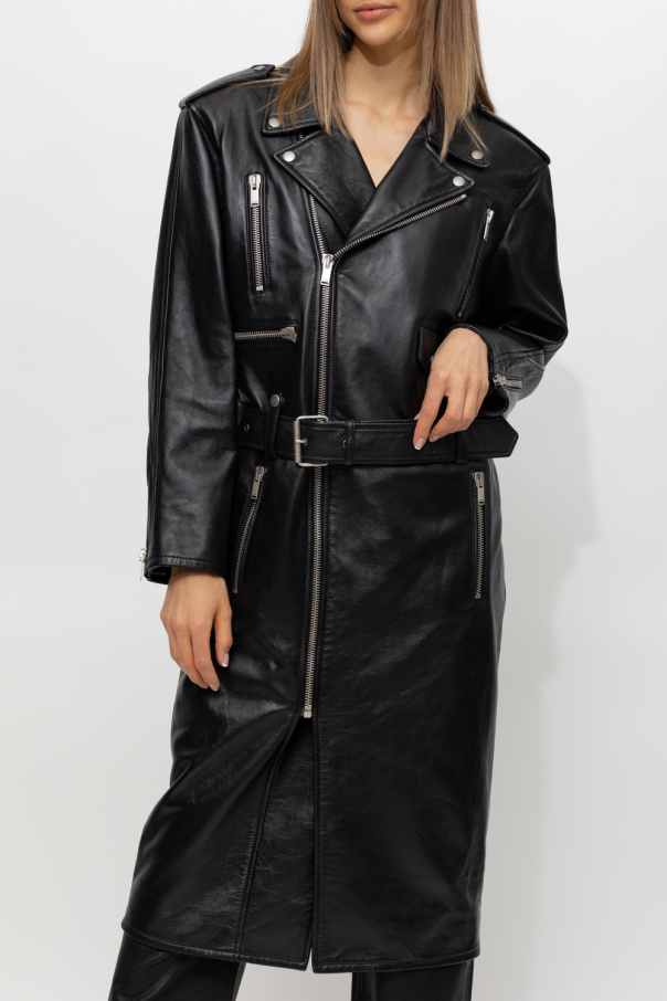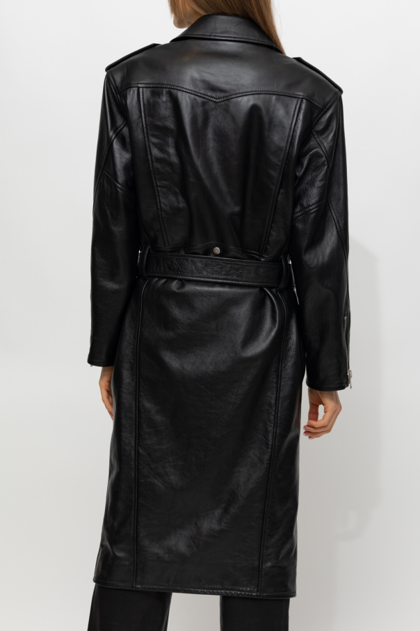 Black coat from Saint Laurent. Made from lamb leather, this style features a zip fastening, a waist-cinching buckle belt, snap closures on the collar and shoulder epaulettes, five zip pockets, one flap pocket and long sleeves with zip cuffs.