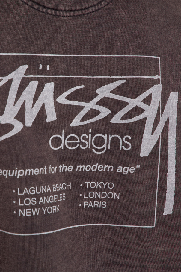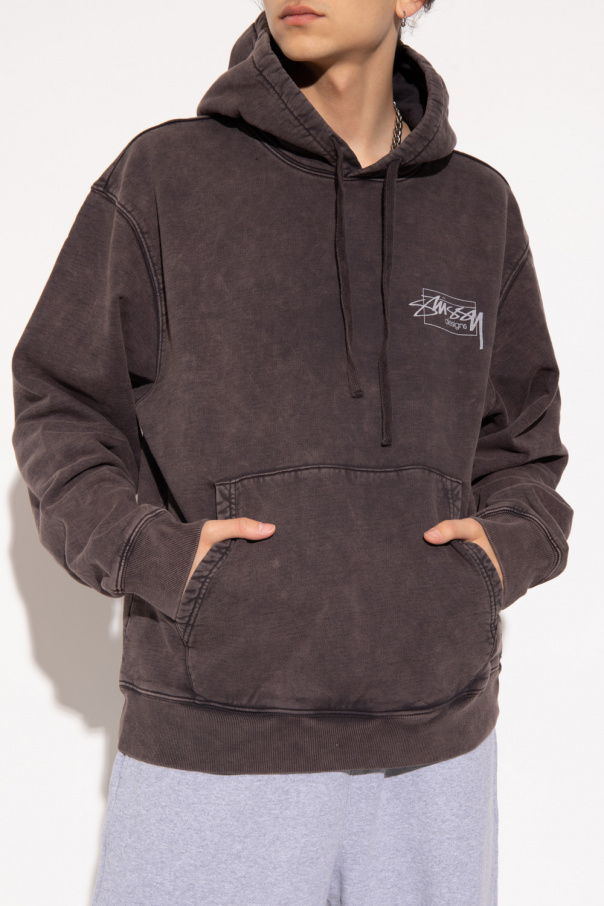 Black hoodie from Stussy. Made of cotton, this garment features a drawstring hood, logo print, front pocket, worn effect and ribbed trims at the hem and cuffs.