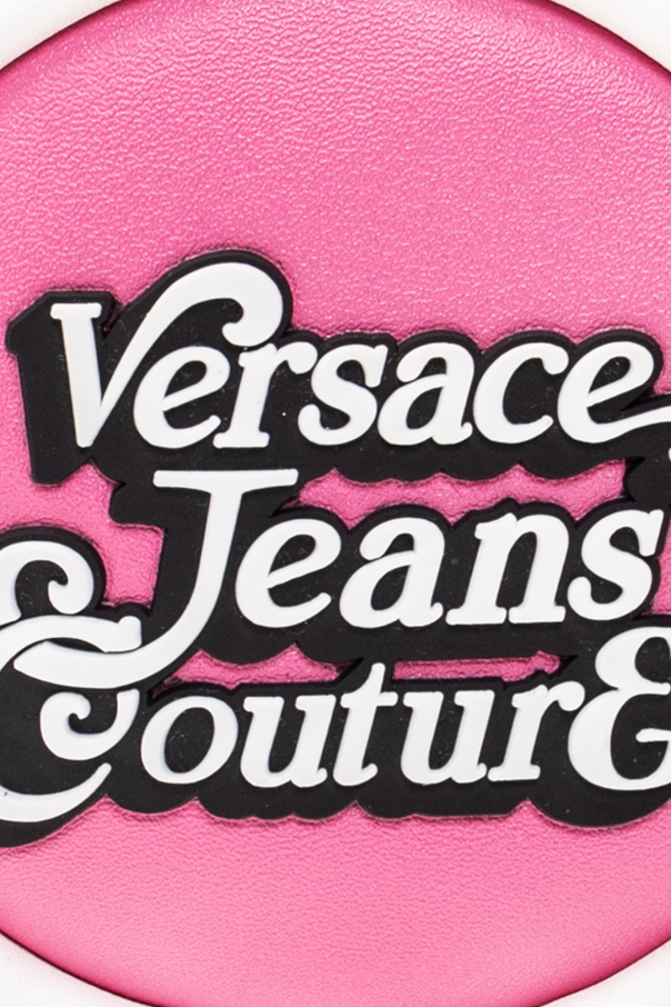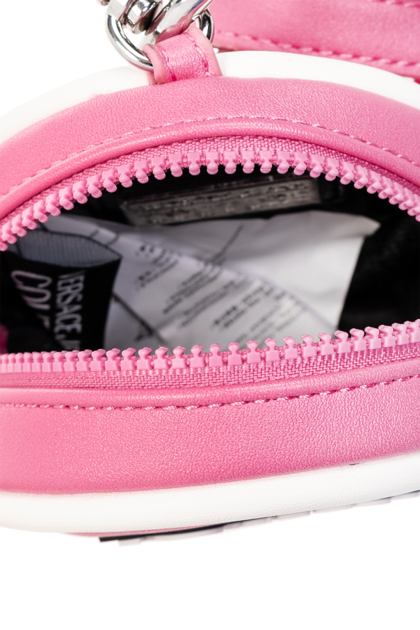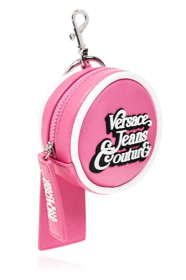 Pink keyring with a pouch from Versace Jeans Couture. Crafted from faux leather, this item features a zipped pouch, logo detail, one internal compartment, detachable ID tag and silver-tone metal hardware.