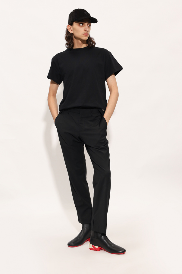 Black ‘Solaris’ ankle boots from Raf Simons. Crafted from leather, this model sits on a cream, red and black rubber sole and features a back zipper and an embossed logo pattern.