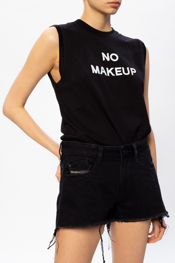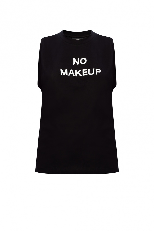 Black crewneck tank top from Diesel. Cut from cotton, this sleeveless style showcases a white appliqué embroidered on the front and a colourful graphic printed on the back.