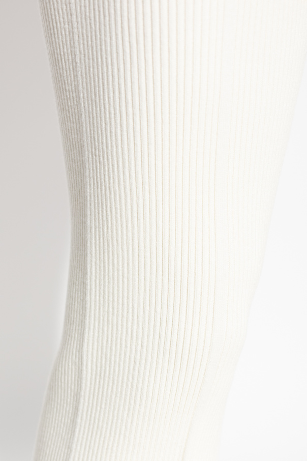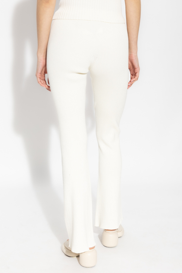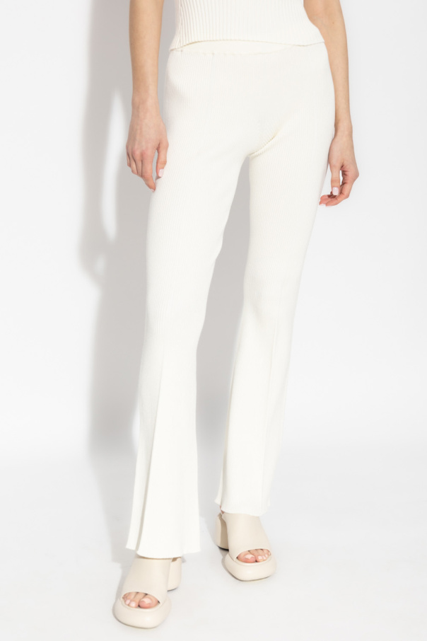 Cream ribbed trousers from Aeron, the ‘Zero’ collection. Made with zero waste, this flared pair has an elastic waistband.