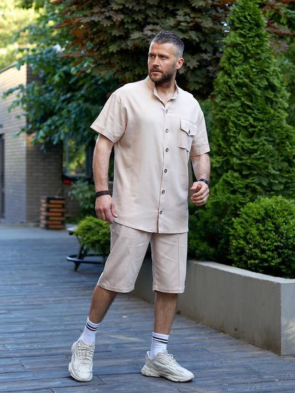 Представляем вам стильный костюм, который сочетает комфорт и современный дизайн. Идеально подходит для летних прогулок и неформальных встреч. Верхняя часть костюма имеет классический фасон с короткими рукавами.Глубокий карман на груди не только функциональный, но и подчеркивает оригинальный дизайн. Шорты свободного кроя обеспечивают максимальный комфорт в теплую погоду, а их длина позволяет сохранять стиль и опрятность. Этот костюм изготовлен из высококачественных материалов, обеспечивающих удобство и долговечность. Независимо от того, идете ли вы на прогулку по парку или на встречу с друзьями, этот костюм станет вашим верным спутником в создании модного образа.Состояние: НовоеЦвет:- Бежевый