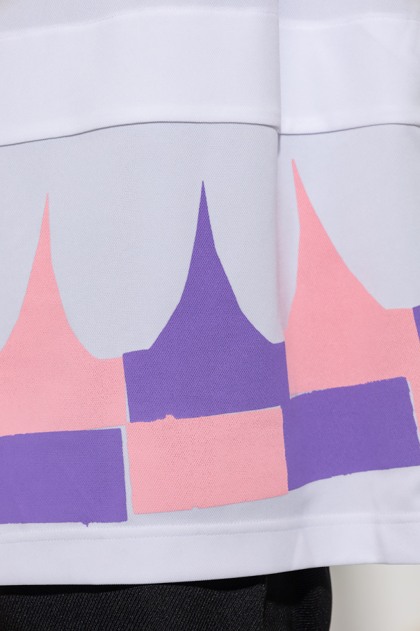 White crewneck T-shirt with short sleeves from Comme des Garcons Homme Plus. Cut with a long fit, this style features a pink and purple graphic at the hem and an attached velcro strap.