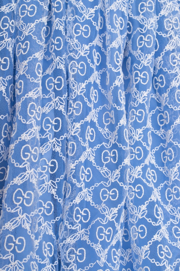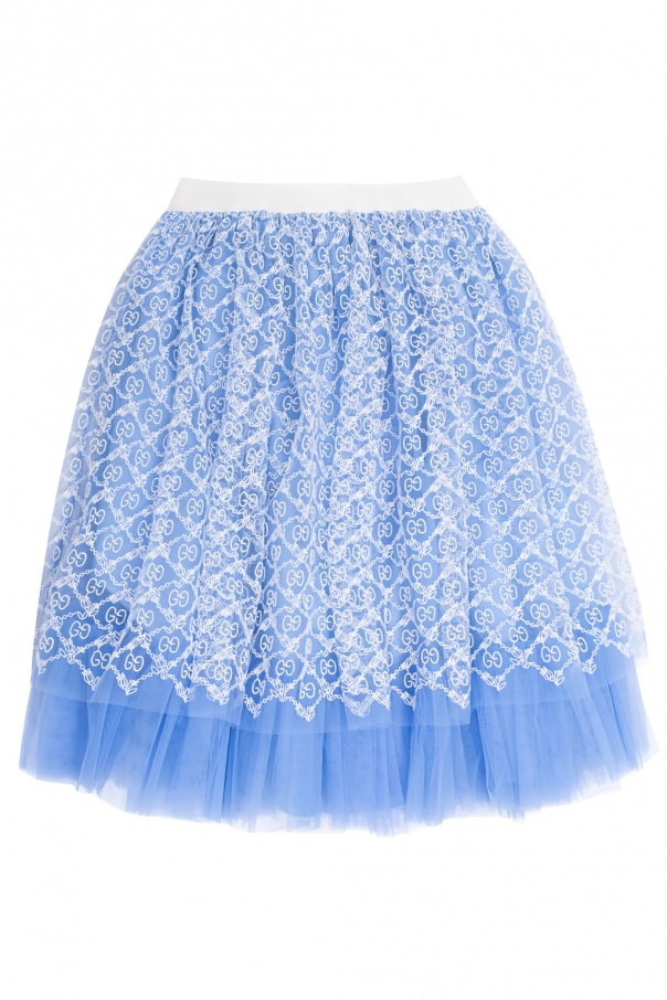 Blue and white skirt from Gucci Kids. Flaunting tulle overlay with GG garland embroidery, this style was finished with an elasticated waistband.