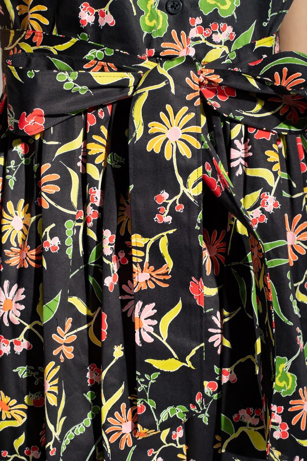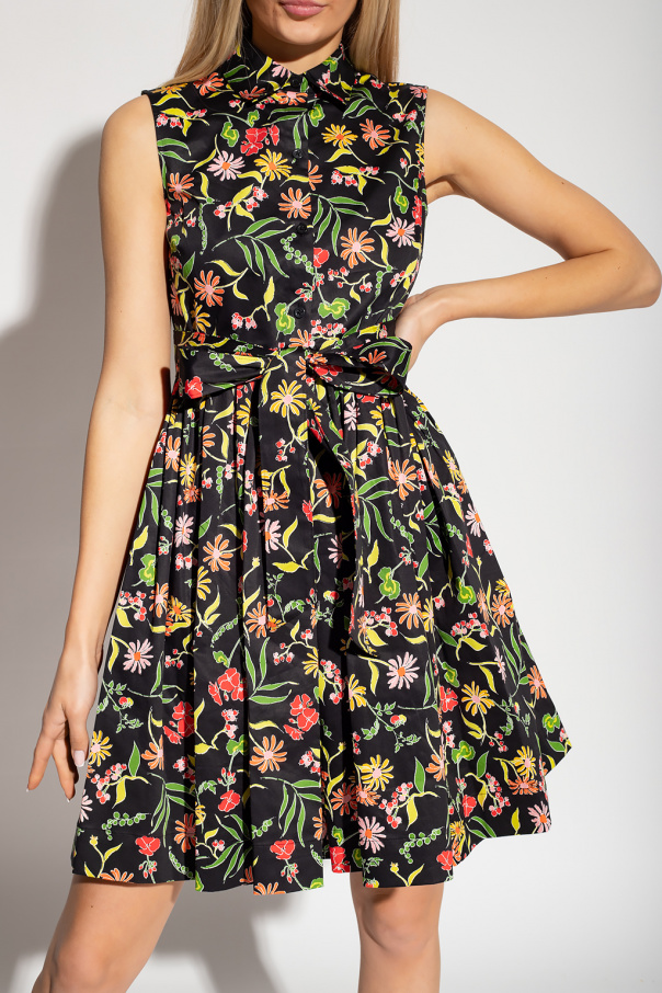 Black sleeveless dress from Kate Spade. Made of cotton, this style showcases a colourful floral pattern, a collar and front with button fastenings, an attached waist-cinching belt and a flared hem with two slip pockets.
