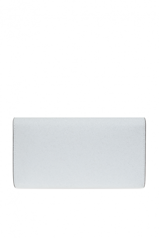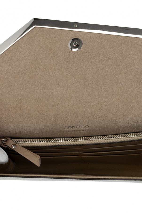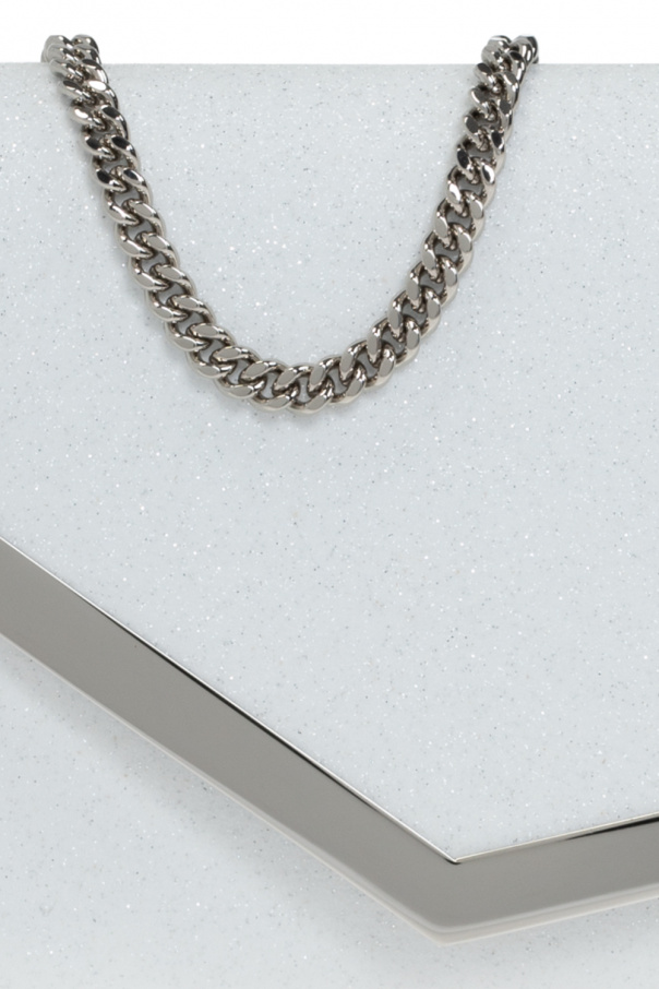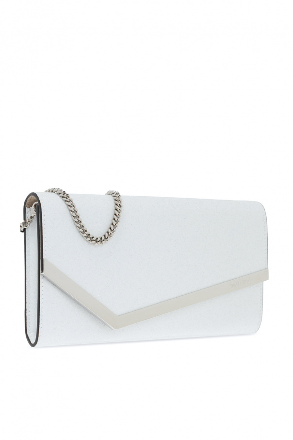 White ‘Emmie’ clutch from Jimmy Choo. Fastened with a snap, this model features silver-tone glitter, embossed logo, detachable chain, silver-tone metal hardware and one internal compartment with one zip pocket, one slip pocket and six card slots.