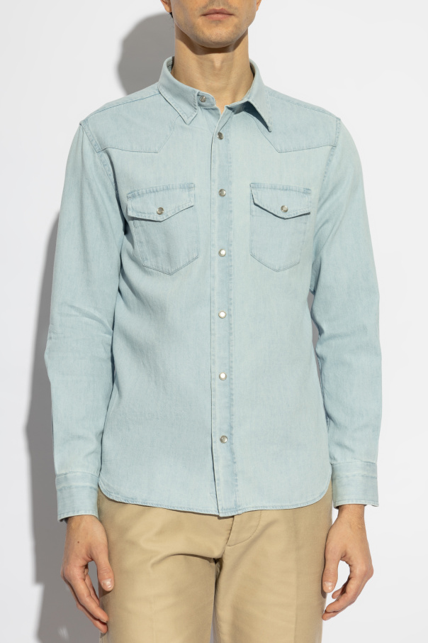 Introducing the Jeansowa koszula, a masterful creation by the iconic designer Tom Ford, whose unparalleled aesthetic has graced the runways of Saint Laurent and Gucci. This light blue denim shirt exudes a perfect synergy of casual sophistication and refined elegance. Crafted from the finest 100% cotton, this classic-cut piece features long sleeves with buttoned cuffs and front snap closures. The dual flap pockets on the chest add a touch of utility, while the subtle stitching on the shoulders and back enhances the silhouette. Whether worn solo or paired with beige trousers and a coat, this versatile shirt seamlessly adapts to any ensemble, showcasing its timeless appeal. Why Choose This Product? Designed by the illustrious Tom Ford, a seven-time CFDA award winner. Impeccable craftsmanship in luxurious 100% cotton denim. Versatile style perfect for both casual and elegant occasions. Distinctive stitching highlights the silhouette. Functional chest pockets with flap closures for added practicality.
