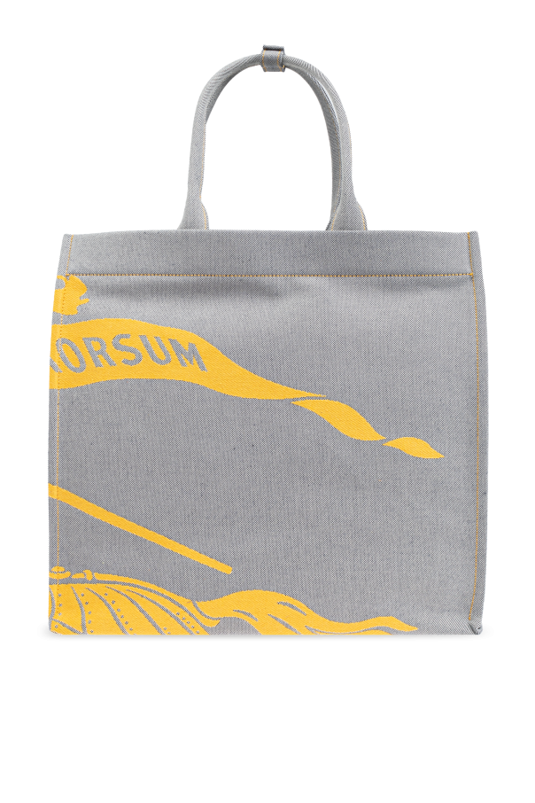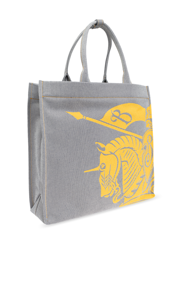 Introducing the ‘EDK Medium’ Shopper Bag from the exclusive collection by Burberry, a symbol of luxury and sophistication. Crafted with meticulous attention to detail, this bag features a striking grey canvas complemented by a vibrant yellow motif of a stylized horse head and initials, making it a distinctive piece in any wardrobe. The bag is constructed from a premium blend of 94% cotton and 6% polyester, ensuring durability and a high-quality feel. Its square, shopper-style silhouette is both simple and highly functional, offering a spacious main compartment for all your essentials. Thin, yet sturdy handles allow for comfortable shoulder or hand carrying. A unique addition is the matching small wallet or pouch, attached via a leash, enhancing its functionality and providing easy organization for smaller items. The interior, finished in a bold yellow, creates a stunning contrast with the bag’s exterior, housing a zippered pouch on a strap for secure storage. This detail not only adds to the bag’s luxurious appeal but also its practicality. Why Purchase This Product? Exclusive Burberry design, blending elegance with functionality. High-quality materials ensuring durability and a premium touch. Unique and eye-catching design with a large yellow horse motif and initials. Functional shopper style with spacious interior and secure zippered pouch. Enhanced organization with a detachable small wallet or pouch.