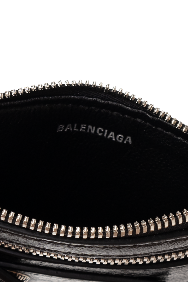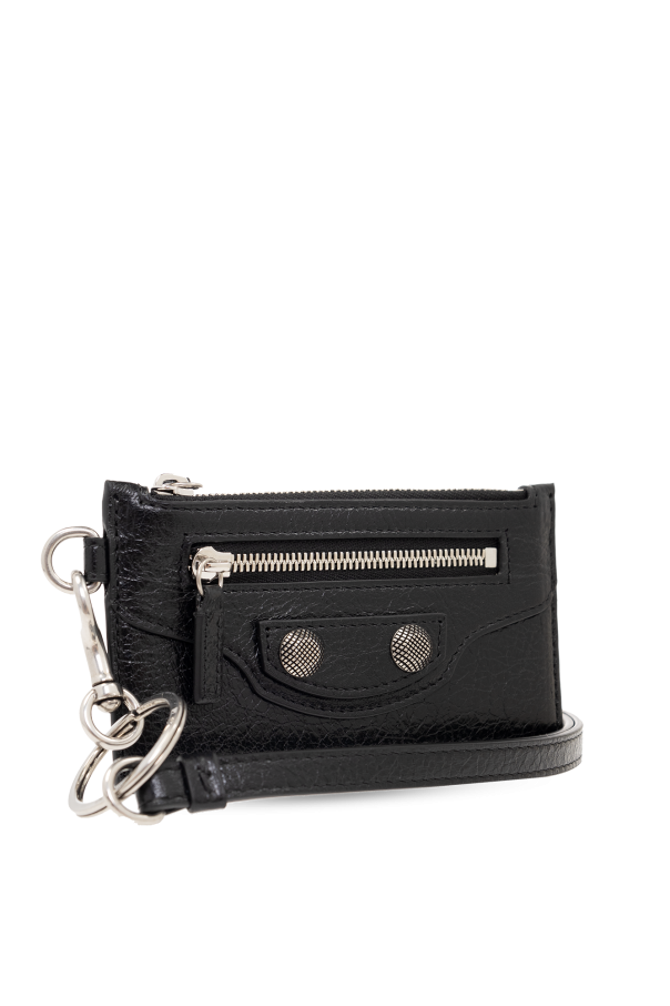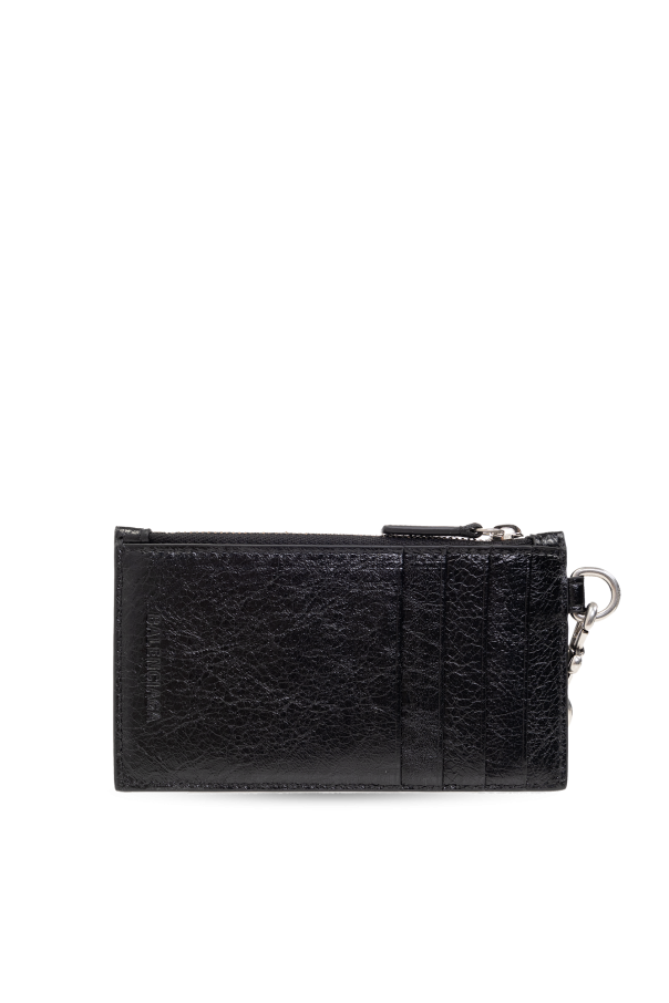 Black card case from Balenciaga. Made from lamb leather with distressed detailing, this item showcases a detachable strap on the side, silver-tone stud embellishments on the front, two zip pockets and four card slots.