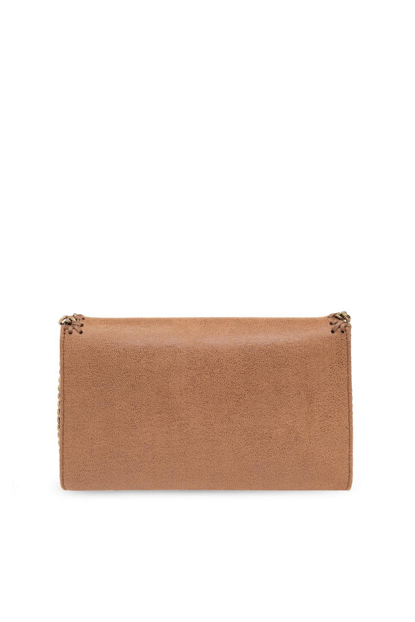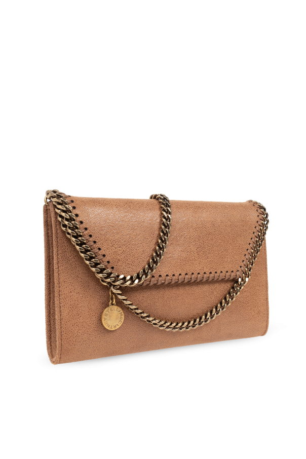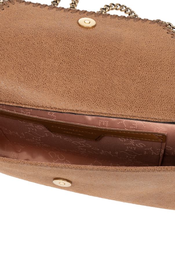 Introducing the \'Falabella\' clutch in a rich brown hue, a testament to the luxurious aesthetic and innovative design synonymous with Stella McCartney. Crafted from premium suede-like polyester, this elegant accessory exudes a sense of opulent texture and sophistication that\'s second to none. The clutch is distinguished by its heavy, golden metal chain that serves not only as a decorative flourish but also as a practical strap, intricately woven with the bag\'s material and threaded through the edges, showcasing an exceptional blend of form and function. The inclusion of a small, round medallion bearing the designer\'s logo adds an exclusive touch, with its embossed detail enhancing the clutch\'s exclusivity. Inside, the clutch is lined with high-quality material, reflecting its upper-tier status. The interior features a compartment and a slip pocket, significantly boosting the bag\'s practicality by offering organized storage for cards and other small essentials. Why Purchase This Product? Exquisite Craftsmanship: Made from high-grade polyester with a suede-like finish for a luxurious feel. Iconic Design: The unique gold-tone metal chain intertwined with fabric edges and the prominent designer logo medallion set this clutch apart. Functional Elegance: Equipped with an interior compartment and slip pocket, enhancing its utility while maintaining its sleek profile. Designer Appeal: A creation by Stella McCartney, renowned for her commitment to sustainability and innovative, chic designs.