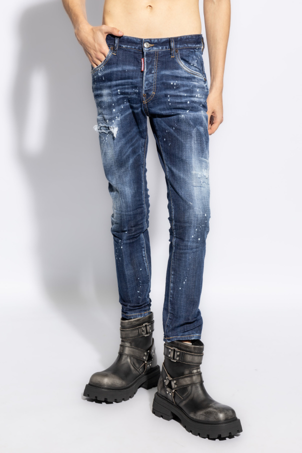 Introducing the quintessence of urban sophistication and sartorial ingenuity: the \'Skater\' jeans by DSQUARED2. Crafted with the utmost precision, these jeans are a manifest blend of 99% cotton and 1% elastane, ensuring both supreme comfort and a flattering fit. The dominant navy-blue hue, accented with deliberate aging effects and distressing, encapsulates a vintage spirit with a contemporary edge. The jeans exhibit an array of distinguishing features: from the artful distressing and intentional holes that imbue them with an authentic \'used\' look, to the striking contrast stitching around the pockets, each detail is meticulously designed. A red tab near the zipper, along with the iconic leather patch embossed with \"DSQUARED2 SINCE 1995\", further accentuates their exclusivity and designer pedigree. Engineered with tapered legs and secured by a button closure, these jeans offer both a snug fit and ease of wear. The five-pocket design not only serves practicality but also enhances the garment’s aesthetic appeal, making the \'Skater\' jeans a paragon of functionality meets style. Why Purchase This Product? Exceptional quality material blend for comfort and durability. Exclusive designer detailing, including a unique red tab and embossed leather patch. Artistic aging and distressing for an authentic vintage appeal. Functional and stylish with a tapered fit and practical pockets.