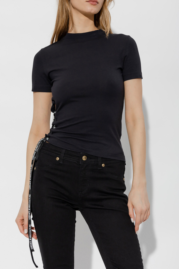Black crewneck T-shirt from Versace Jeans Couture. Crafted from cotton, this style showcases a ribbed collar, short sleeves and lace-up detailing with a white logo on the side.