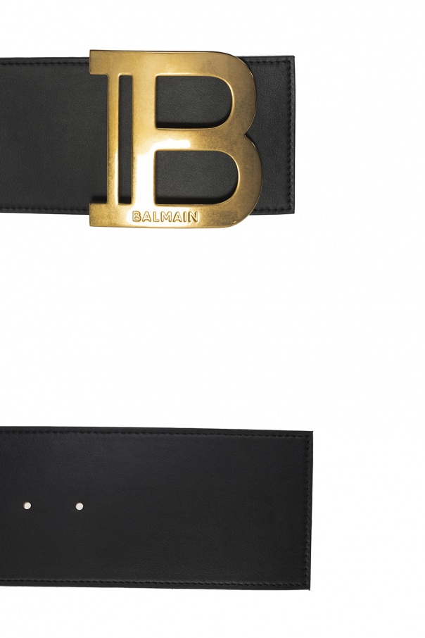 Black, wide waist belt from Balmain. Crafted from calf leather, this item has a gold-tone logo-shaped metal buckle.