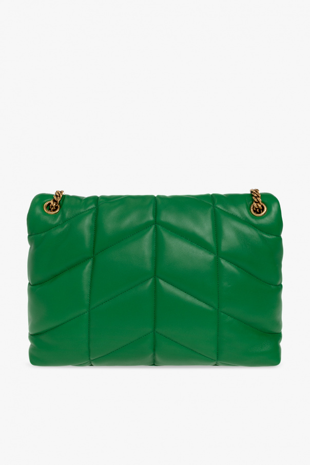 Green ‘Puffer Medium’ quilted shoulder bag from Saint Laurent. Made from lamb leather, this design secures with a magnetic snap and features metal YSL initials on the front, a chain and leather shoulder strap, antiqued gold-tone metal hardware and one internal compartment with one zip pocket.