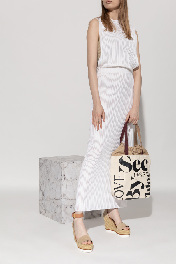 Beige ‘Glyn’ wedge sandals from See By Chloé. Made of suede, this pair features a brown leather ankle strap with a buckle and rubber sole with jute trims in white, brown and beige.