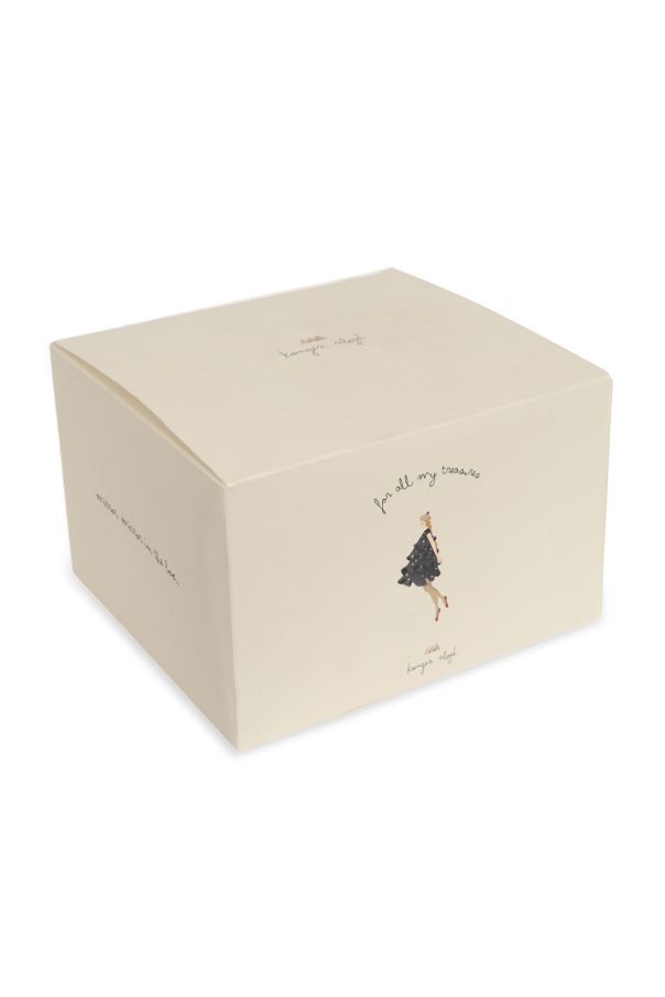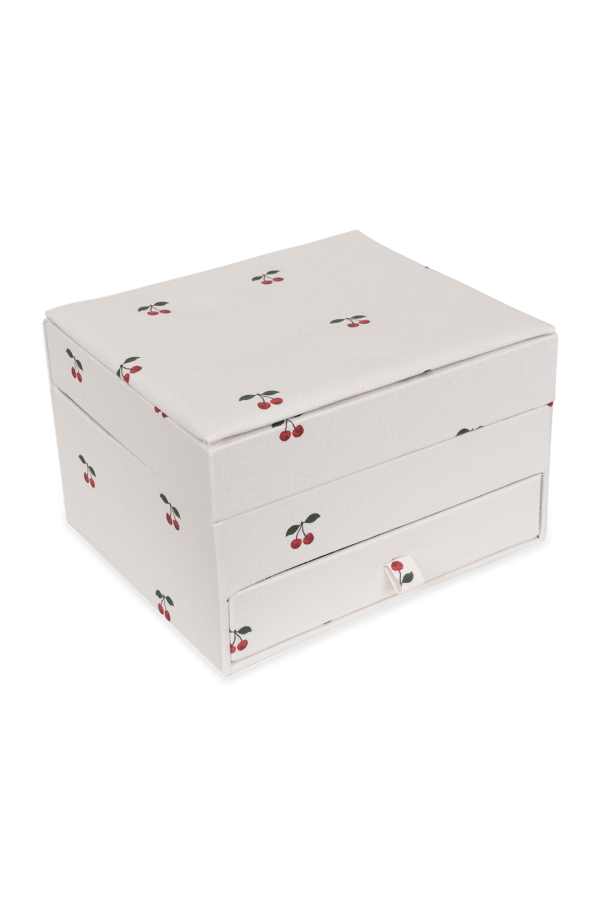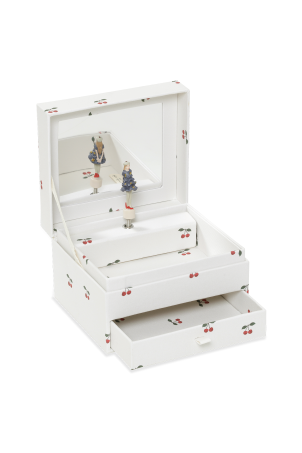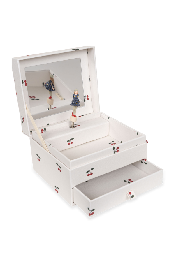 White ‘Treasure Cherry’ music box from Konges Slojd. Made from cotton, this item features an additional drawer, a mirror and a rotating mirror that spins to the melody coming out of the casket.