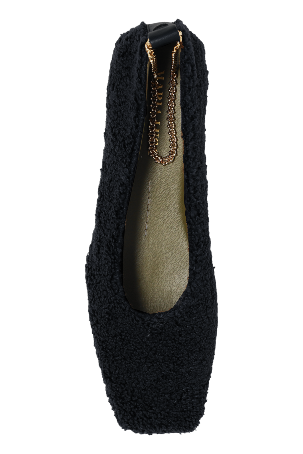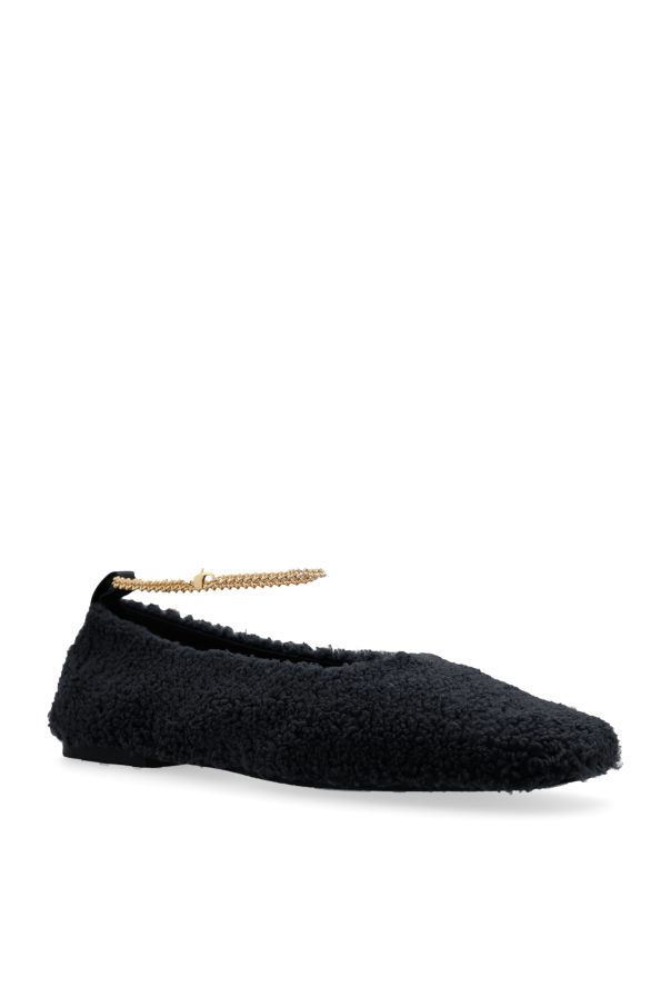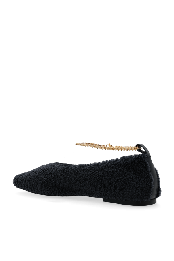 Introducing the exquisite ‘Augusta’ Ballerinas by the renowned designer Maria Luca. These black ballerinas exemplify the epitome of elegance and sophistication, blending classic design with contemporary, luxurious details. Crafted with a textured surface that mimics the allure of bouclé or fur-like fabrics, these ballerinas stand out with their unique, tactile finish. The black color ensures versatility, making them a perfect complement to a wide array of ensembles. The ballerinas showcase a timeless, rounded toe silhouette and a low-profile structure, characteristic of traditional ballet flats. A striking gold chain adorns the ankle, adding a touch of opulence and serving as a decorative yet functional element that enhances the overall fit. The interior is lined with supple leather, ensuring comfort and breathability, while the beige leather sole provides durability and a refined aesthetic. Why Choose This Product? Unique Texture: The bouclé-like surface offers a distinctive and luxurious look. Elegant Design: The classic ballet shape with modern, chic details. Gold Chain Detail: Adds a sophisticated touch and ensures a secure fit. Versatile Color: The black color makes these ballerinas suitable for various outfits. Premium Materials: Leather lining and sole for superior comfort and durability.