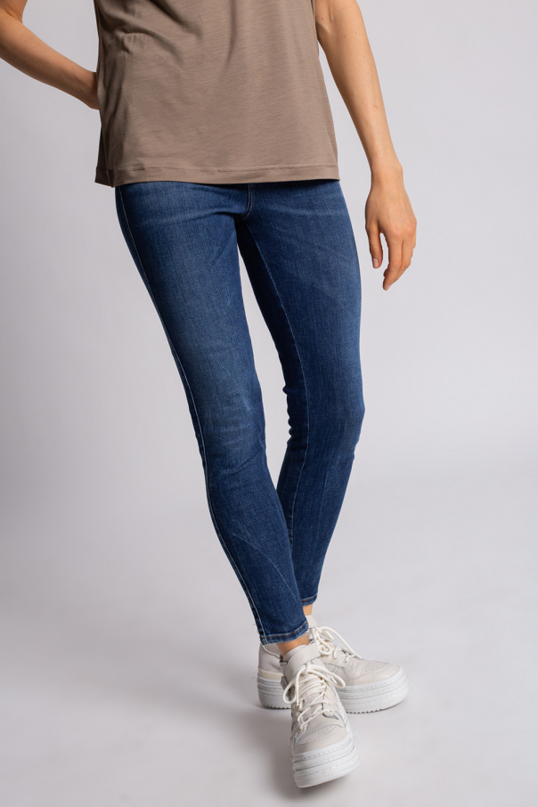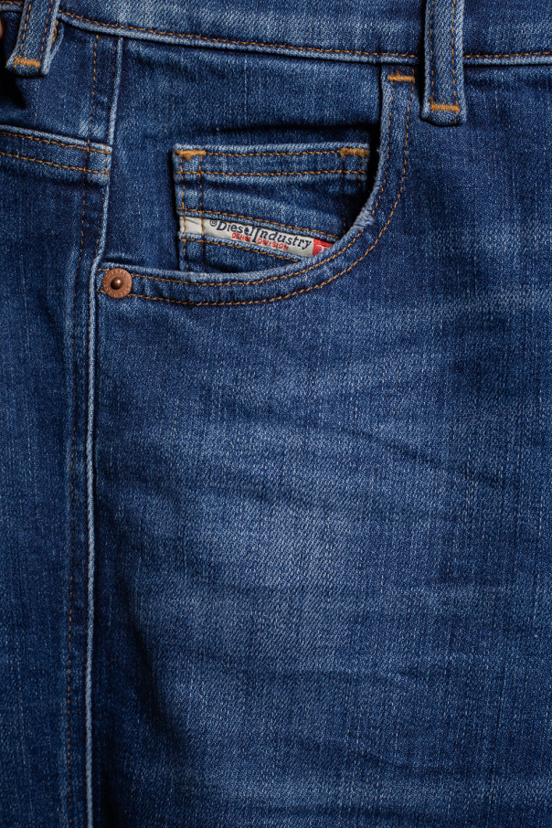 Blue ‘Slandy’ skinny jeans from Diesel. Fastened with a zip fly and button, this pair falls down with tapered legs and features logo patches, orange stitching details, three front pockets and two back pockets.