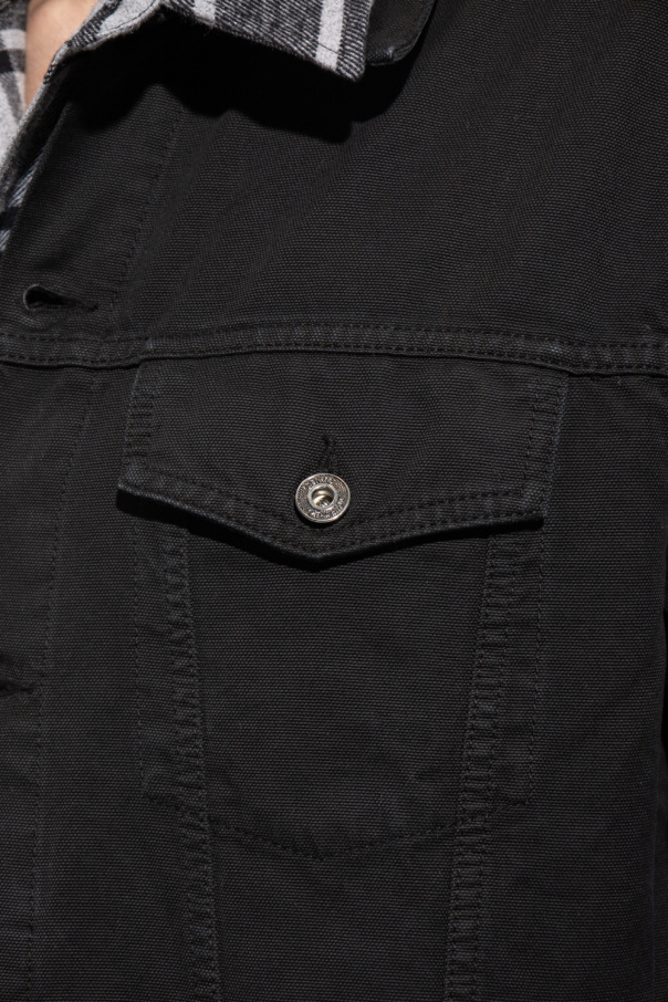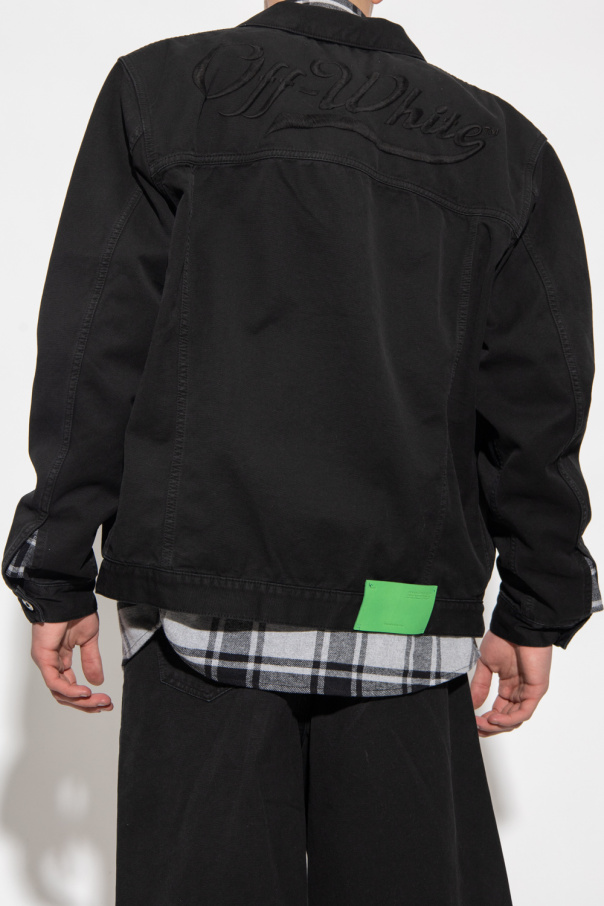 Black denim jacket from Off-White. Made of cotton, this long sleeve design features button fastenings, embroidered logo pattern, green patch, two slip pockets and two flap pockets.