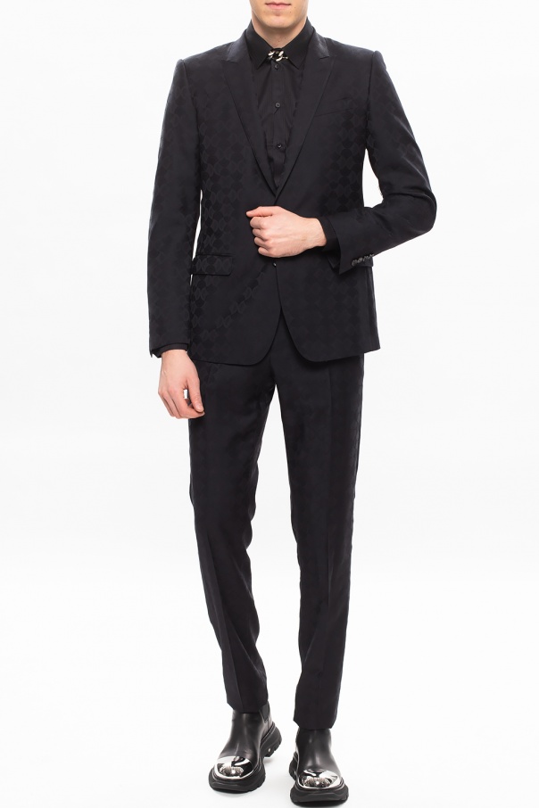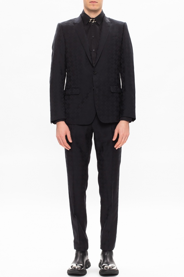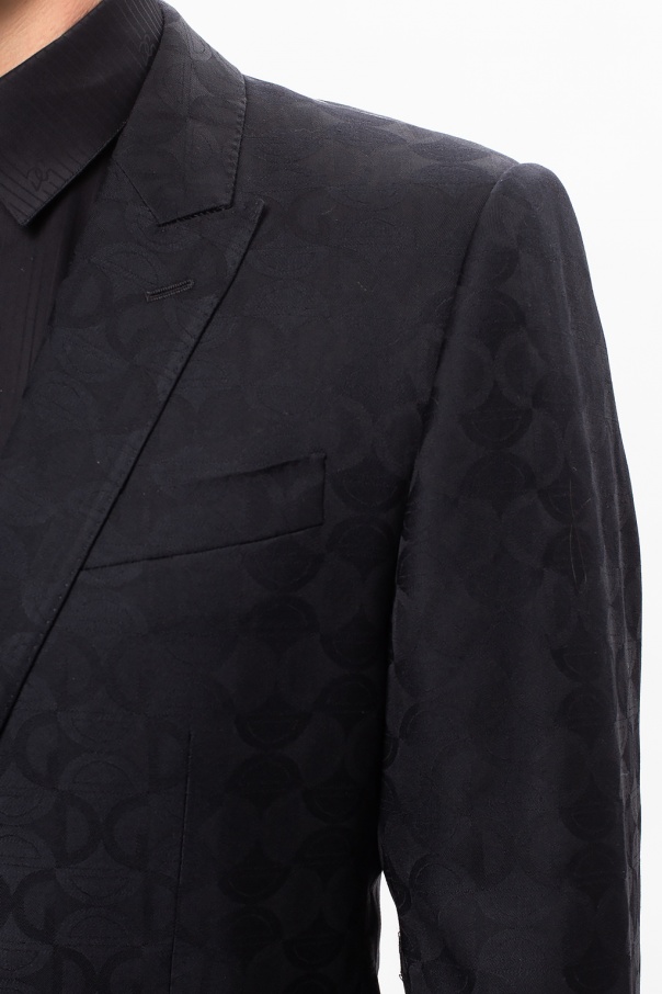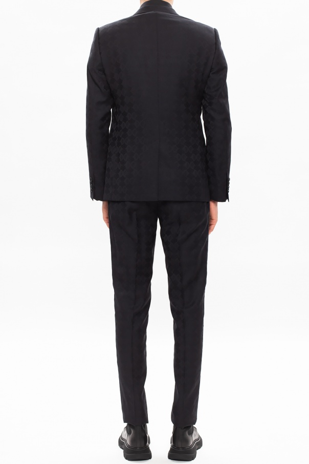 Black suit from Dolce & Gabbana. Crafted from wool knit, this design includes: a blazer with peaked lapels, button closing, one welt pocket and two flapped pockets on the front, padded shoulders and a single vent on the back as well as tailored pants with zip fly, button closing, four slip pockets on the front and two buttoned pockets on the back.