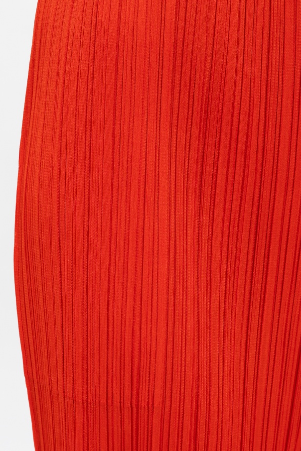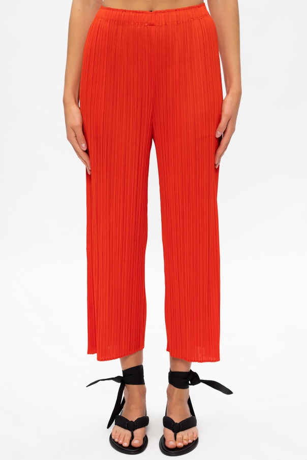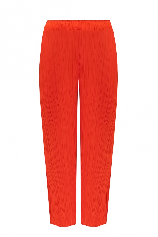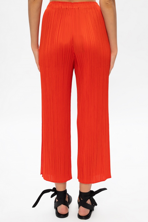 Red trousers from Issey Miyake Pleats Please. Arrayed with the label\'s signature pleating, this pair has an elasticated waistband and straight, cropped legs with vents at leg openings.