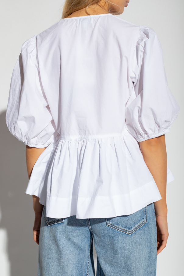 White top from Ganni. Crafted from organic cotton, this design features an elastic waistband, V-neck and short sleeves with ribbed cuffs.
