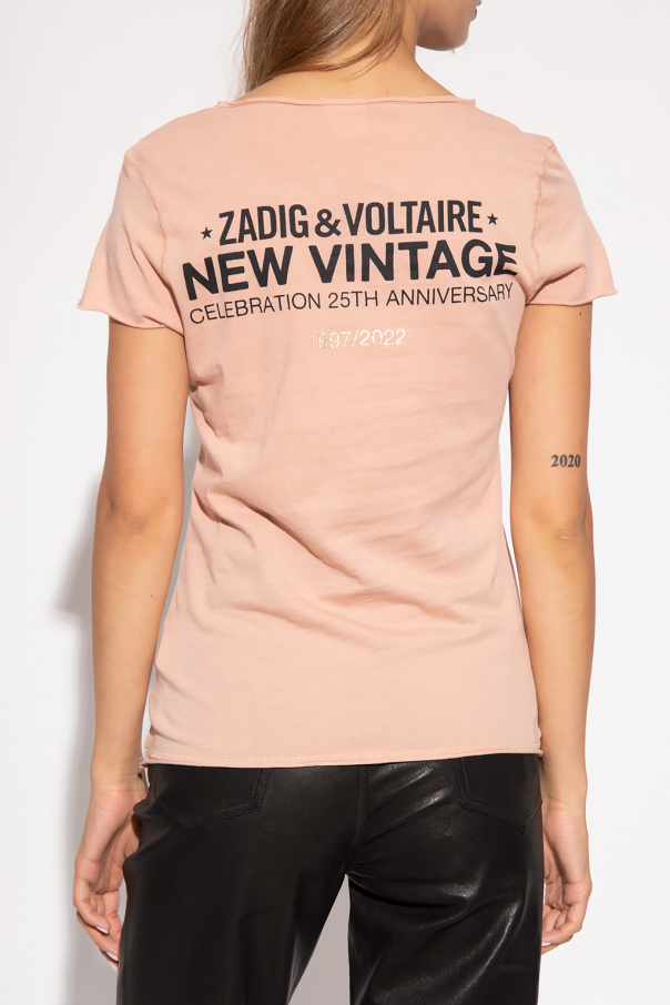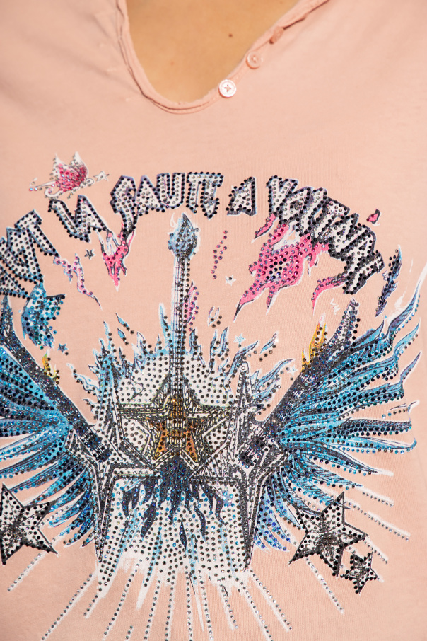 Blush pink ‘Tunisien’ V-neck T-shirt from Zadig & Voltaire. Crafted from organic cotton with the GOTS certificate, this style features decorative buttons, a colourful graphic with all-over glossy appliqués on the front and a black and gold-tone graphic print celebrating the brand\'s 25th anniversary at the back.
