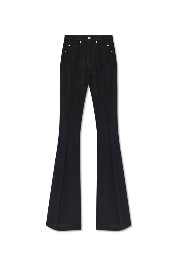 Black ‘Bolan’ trousers from Rick Owens. Made of wool, this pair falls with flared legs and features a zip fly with a button and six slip pockets.