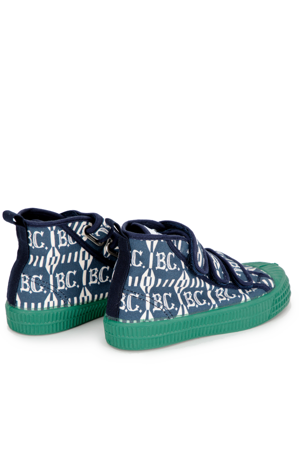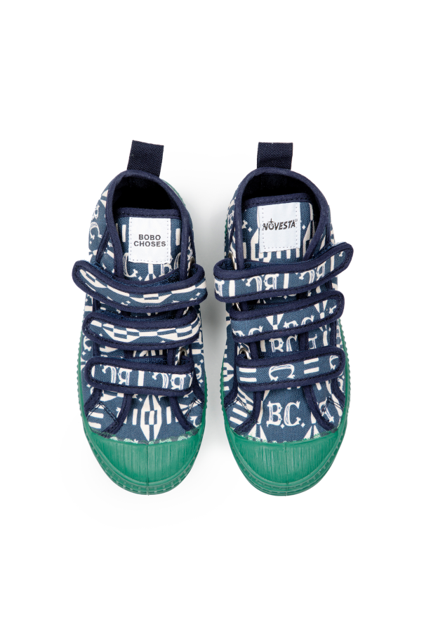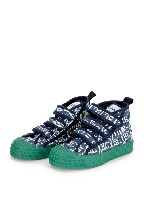 Introducing the Bobo Choses High-Top Sneakers—an epitome of modern elegance and playful design, specifically crafted for the joy and comfort of children. These exclusive high-top sneakers combine a sophisticated silhouette with a vibrant color palette, making them a perfect choice for any occasion. The sneakers, predominantly navy blue, feature a striking contrast with green accents on the toe and sole, and are adorned with a white pattern and “BC” initials, epitomizing the brand\'s distinctive style. The sturdy textile upper ensures breathability and lightness, while the durable rubber sole provides excellent grip and longevity. Comfort and ease are paramount with these sneakers; the four hook-and-loop straps guarantee a secure fit and simple on-and-off wear, making them ideal for active children. The inner tongue proudly displays the brand’s label, a testament to its premium craftsmanship. Why choose these sneakers? Elegant and modern high-top design for added ankle support. Durable textile material for breathability and comfort. Rubber sole for superior traction and durability. Easy-to-use hook-and-loop straps for a secure and adjustable fit. Stylish color contrast and signature branding for a unique look.