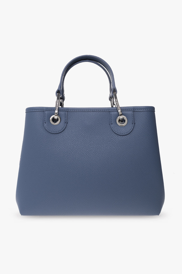 Blue shoulder bag from Emporio Armani. Made of faux leather, this design fastens with a magnetic snap and is enriched by a silver-tone logo print and detachable logo charm. It is complete with two half-round handles, detachable and adjustable strap in cream and orange with a logo, dark brown lining, silver-tone metal hardware and one internal compartment with a detachable zipped pouch.