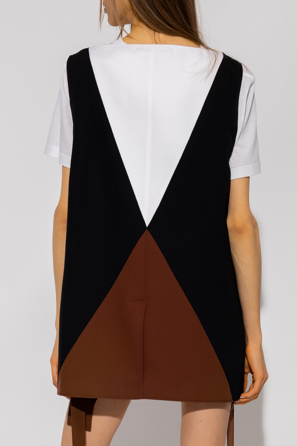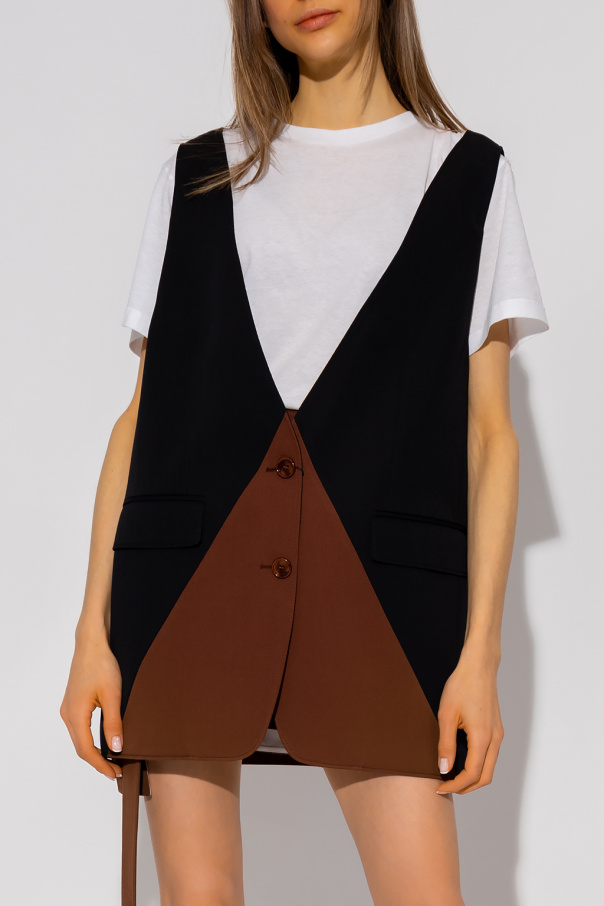 Black, brown and white oversize vest from Burberry. Made of wool, this garment features button fastenings, two flap pockets and a single rear vent.