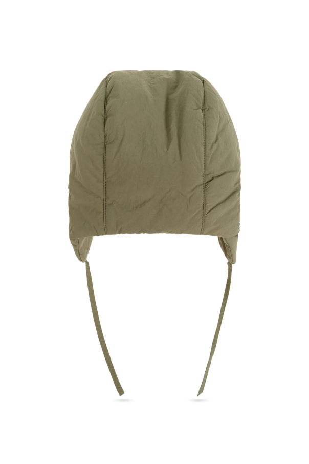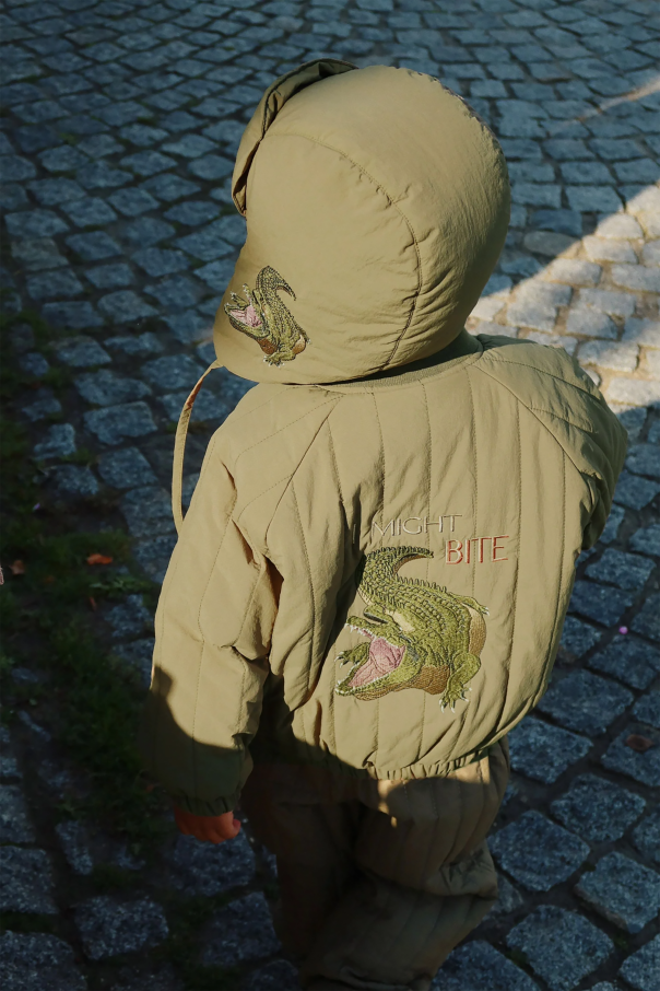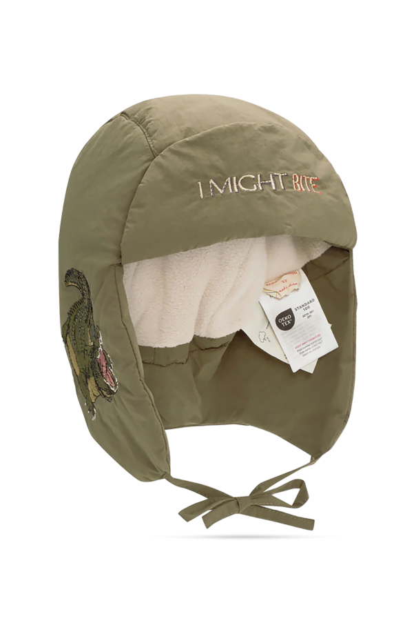 Introducing the Green Tie-Up Hat from the exclusive collection of children\'s wear by Konges Sløjd. This distinctive hat, designed in the iconic trapper style, features long ear flaps that can be elegantly tied under the chin, ensuring optimal warmth and protection. Crafted from high-quality nylon on the exterior, this hat is both water-resistant and windproof, making it an ideal choice for colder climates. The interior is luxuriously lined with soft white fur, offering unparalleled comfort and insulation. The hat is adorned with intricate details, including an embroidered front that boldly declares \"I MIGHT BITE\" and a charming side embroidery of an open-mouthed crocodile. These unique embellishments add a playful yet refined touch to the overall design. The lush green hue of the hat complements a matching jacket, suggesting a coordinated set for the discerning parent. Each piece is meticulously tagged, reflecting the superior quality and thoughtful craftsmanship synonymous with Konges Sløjd. Why Choose This Product? Exceptional Warmth: The hat is lined with plush white fur for superior insulation. Weather-Resistant: Made from high-quality nylon, it offers protection against wind and water. Unique Design: Features exclusive embroideries that set it apart from ordinary winter wear. High-Quality Craftsmanship: Reflects the excellence and attention to detail of Konges Sløjd.