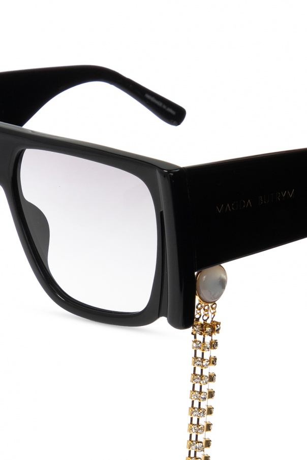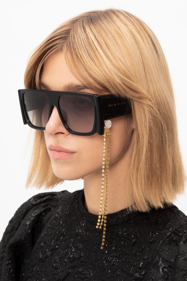 Black ‘All eyes on me’ sunglasses from Linda Farrow x Magda Butrym. Crafted from acetate, this attention-grabbing pair was distinguished with gold-tone charm, which was embellished with spherical mother-of-pearl detail and encrusted with Swarovski crystals, gold-tone logo embossing as well as certificated black lenses, which ensure UVA/UVB protection. This item comes with an included protective case.