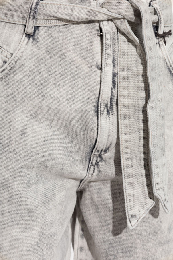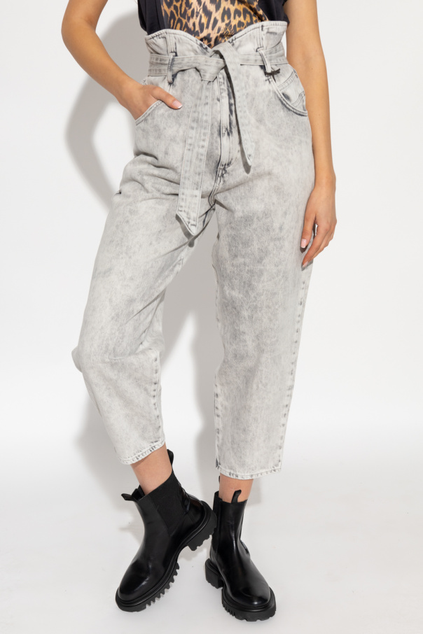 Light grey ‘Sammy’ jeans from AllSaints. With a paperbag cut, this pair features a high-rise waist, a vintage treatment, a zip fly with a button, a waist-cinching belt, four slip pockets and slightly tapered legs.