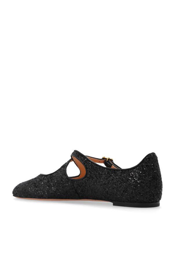 Black ballet flats from Bally. Made from leather and spruced up with glitter, this model sits on a light pink leather sole and features an adjustable strap with a gold-tone buckle on the front.