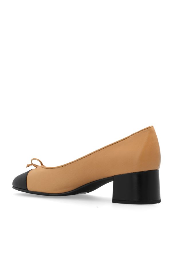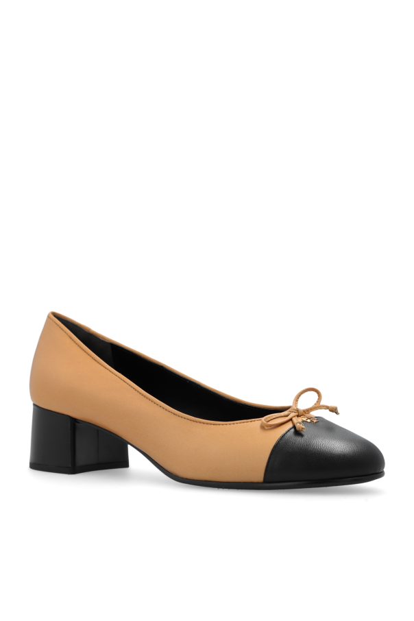 Beige and black ‘Cap -Toe’ pumps from Tory Burch. Made of smooth leather, this pair features a decorative bow with a gold-tone logo and a black leather sole.