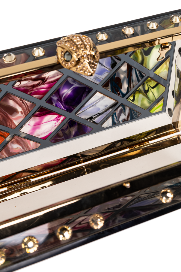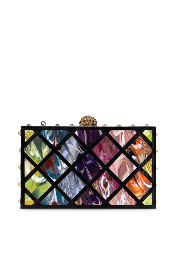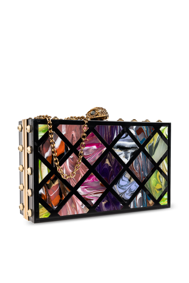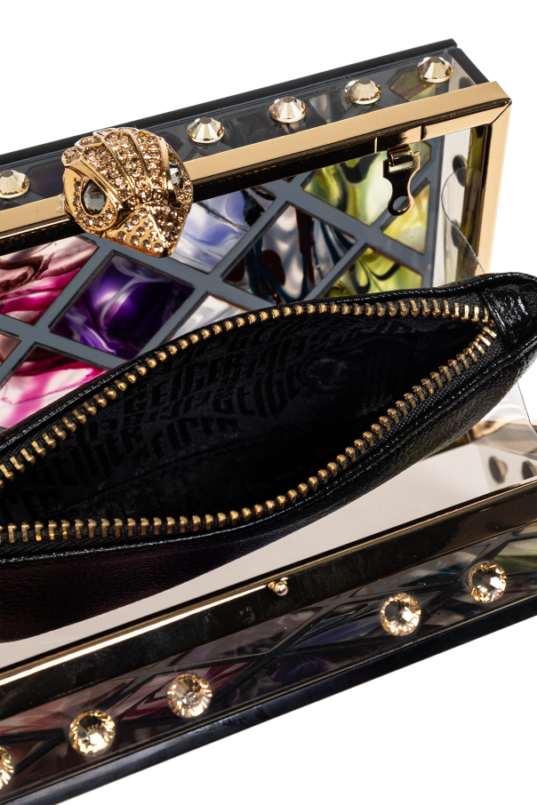 Introducing the exquisite Crystal Quilt Box Clutch by renowned British designer Kurt Geiger. This captivating accessory, crafted for the discerning woman, epitomizes opulence and artistry. With its rectangular silhouette, the clutch showcases a mesmerizing pattern reminiscent of stained glass, composed of vibrant geometric shapes. The exterior is adorned with a stunning mosaic effect, while the gold-toned metal finishes, including a chain strap and ornate edge decorations, add a touch of sophistication. The clasp, embellished with golden jewelry-like elements, elevates the piece to a true work of art. The multicolored design features a kaleidoscope of hues, ranging from purples and pinks to greens and yellows, ensuring it stands out as a statement piece. Inside, a black leather zip pocket with the brand\'s logo provides a luxurious touch, complemented by a subtle exterior logo. Why Choose This Product? Exquisite geometric mosaic design Gold-toned metal embellishments Interior leather zip pocket with logo Iconic piece from Kurt Geiger
