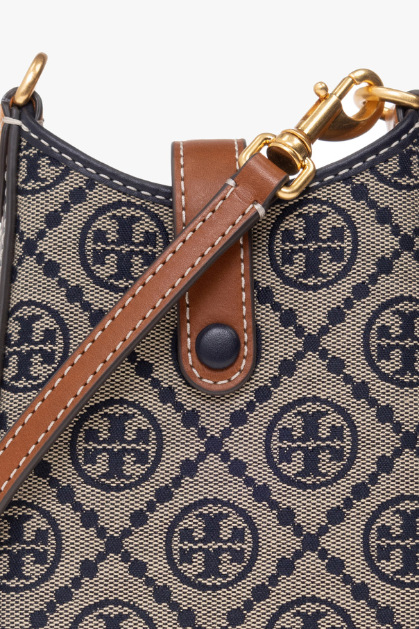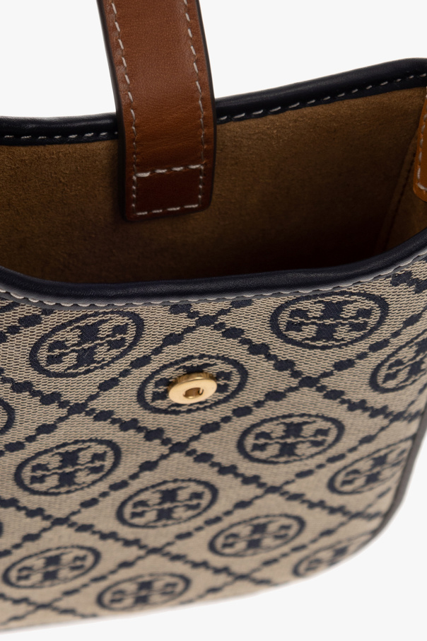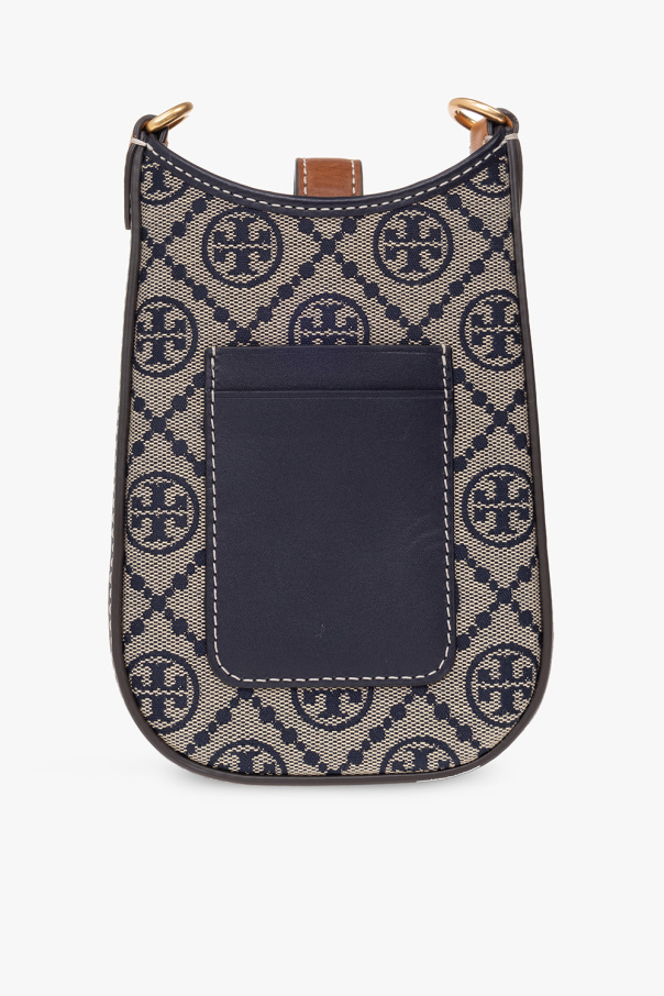 Navy, grey and brown phone pouch from Tory Burch. Made of fabric with a monogram pattern inspired by traditional Pennsylvania Dutch quilting, this model is complete with leather trims, snap button, two card slots at the back, detachable and adjustable strap, one internal compartment and gold-tone metal hardware.