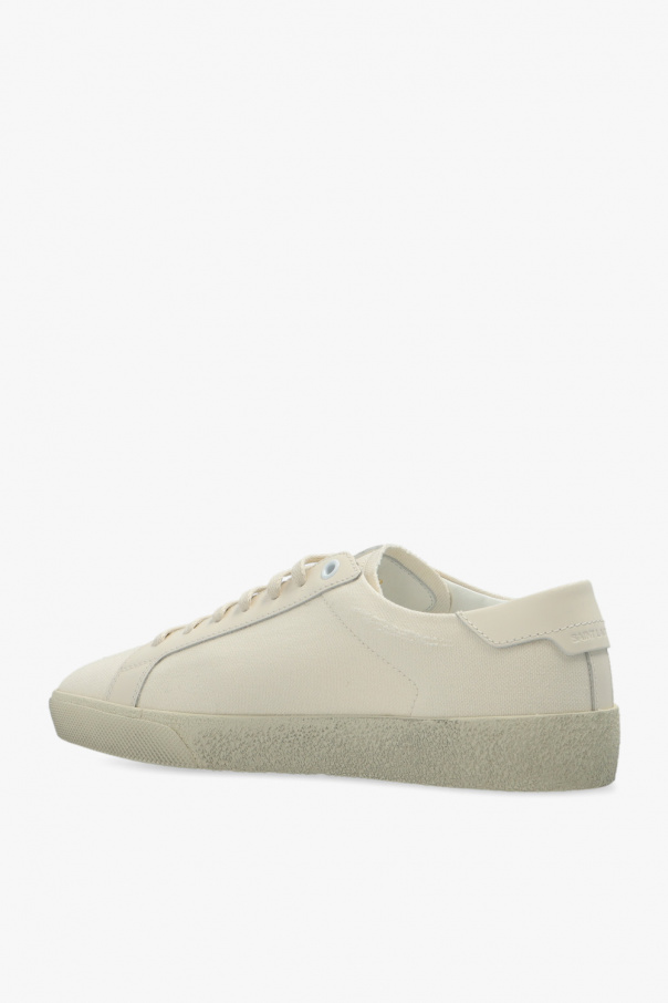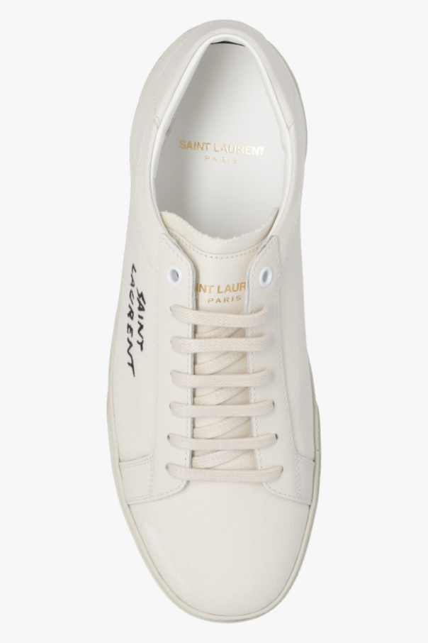 Cream ‘SL/06’ sneakers from Saint Laurent. Crafted from cotton, this lace-up model sits on a cream rubber sole and features calf leather trims and an embroidered and printed logo.