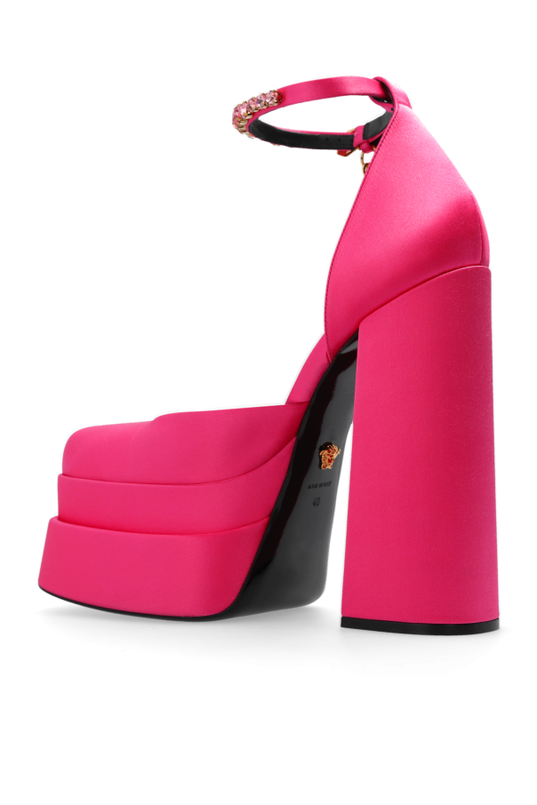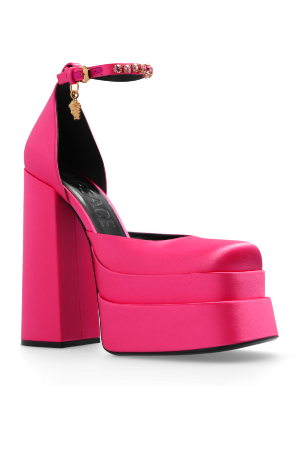 Pink ‘Medusa Aevitas’ platform pumps from Versace. Made of satin, this design features rests on a black leather sole and features an ankle strap with a buckle embellished with pink crystals and the brand’s signature Medusa head charm in gold-tone.